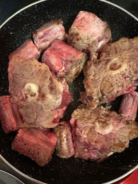 - Heat a large heavy pan and add your oxtail pieces to it. (no oil needed if oxtail has enough fat)